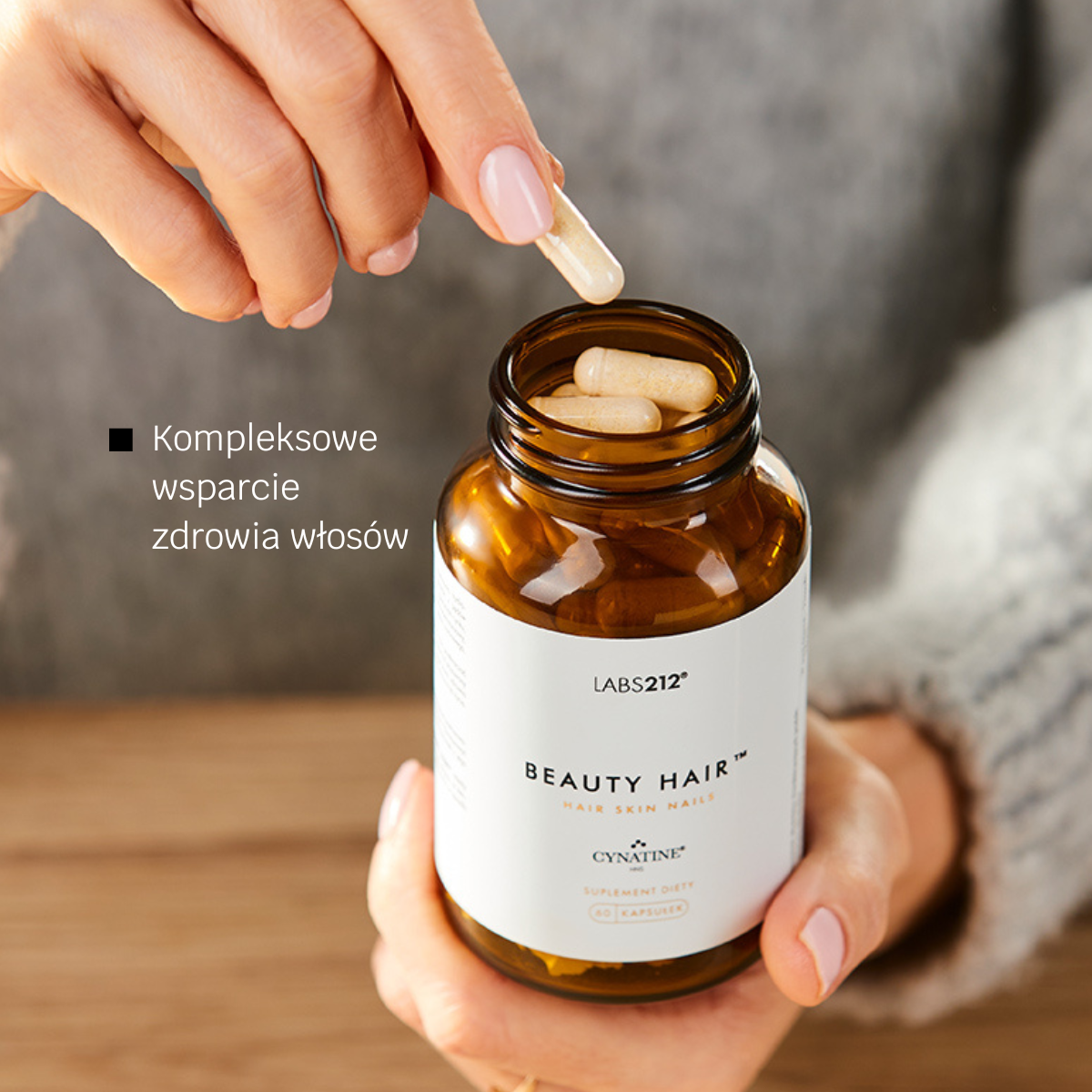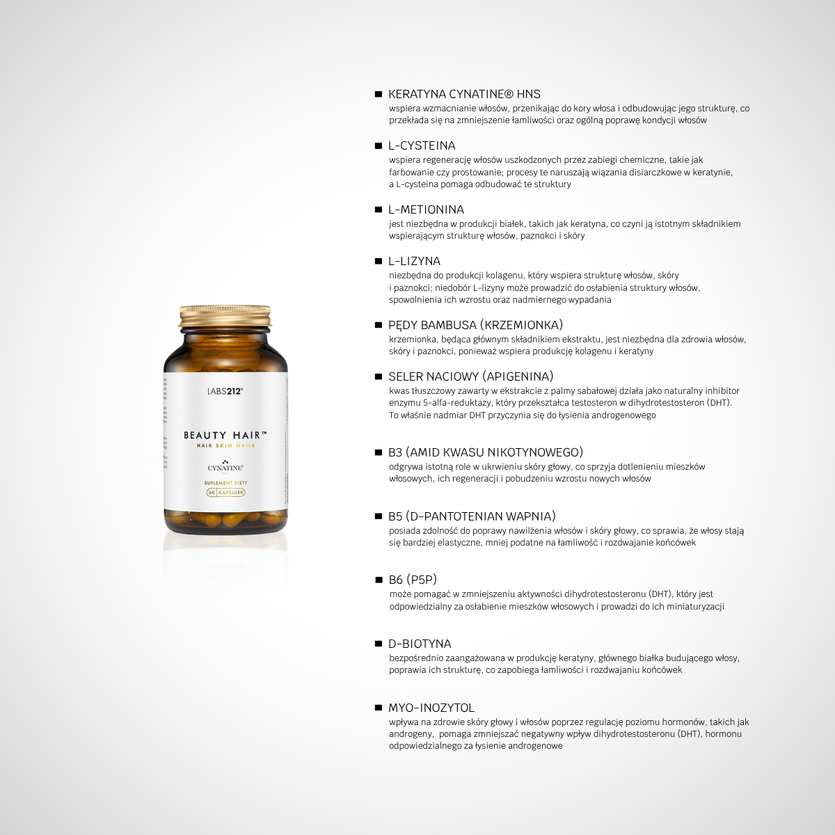 BEAUTY HAIR™ dietary supplement is a formula provided in capsules containing keratin hydrolysate Cynatine® HNS, L-cysteine, L-methionine, L-lysine, bamboo shoot extract DER 98:1 standardised to contain 70% silica, saw palmetto fruit extract DER 20:1 standardised to contain 45% fatty acids, celery seed extract DER 98:1 standardised to contain 98% apigenin, vitamin B3, vitamin B5 as calcium D- pantothenate, vitamin B6 as p-5-p, biotin as D-biotin, inositol as myo-inositol, zinc as zinc gluconate.