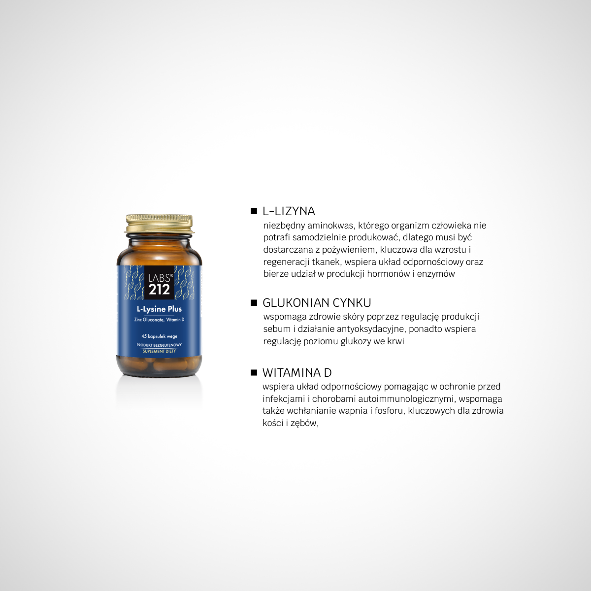 L-Lysine Plus is a dietary supplement provided in vegan capsules containing lysine, zinc in the form of an organic compound (zinc gluconate) and patented Vitamin D derived from lanolin (sheep’s wool).