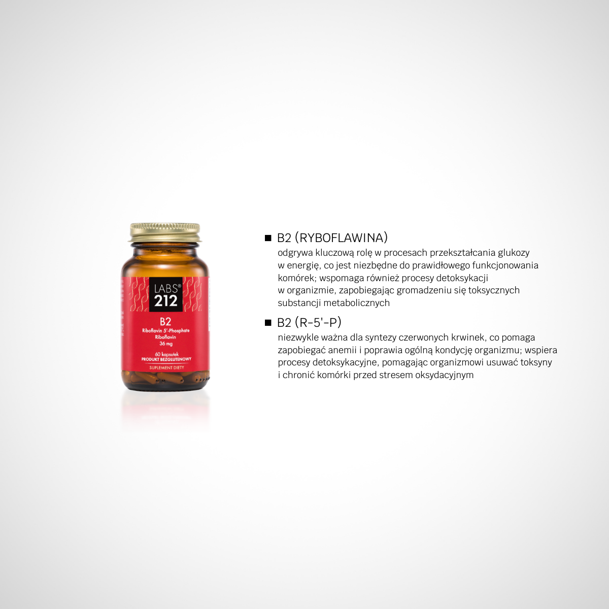 Vitamin B2 R-5′-P + Riboflavin is a capsule-form supplement containing Vitamin B2 in two forms: Riboflavin 5′-Phosphate (R-5′-P) and Riboflavin. Riboflavin is a compound with a characteristic yellow and orange colour, discovered during work on the analysis of cow’s milk and known until the 1920s as Lactochrome.