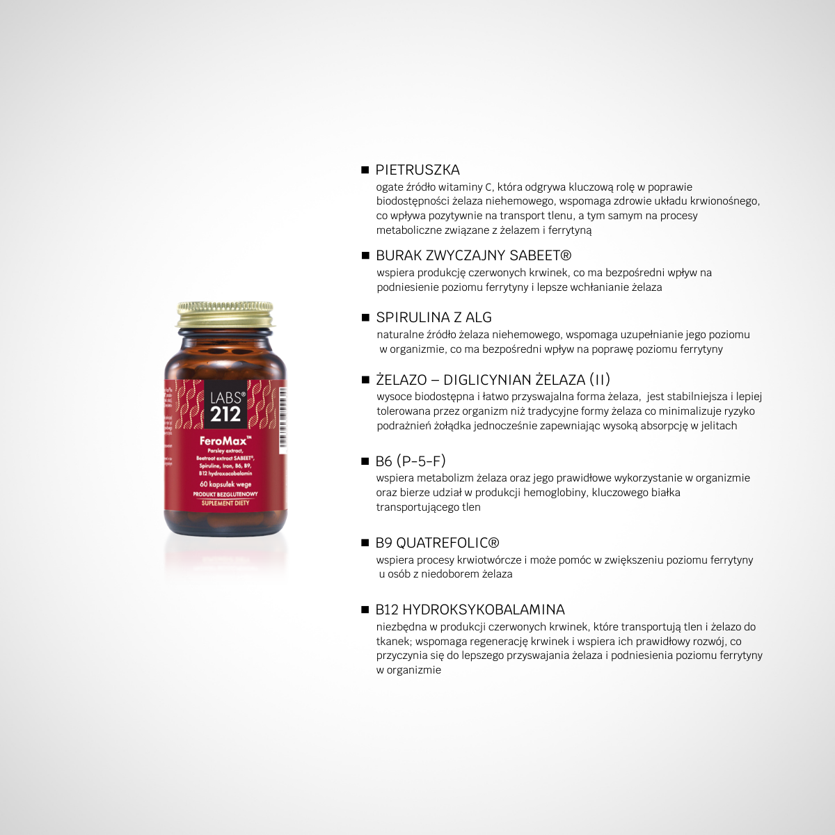 FeroMax® is a dietary supplement provided in vegan capsules containing: parsley leaf extract (Petroselini crispum), SABEET® beetroot root extract (Beta vulgaris), spirulina from algae (Arthospira Platensis), iron in the form of iron (II) bisglycinate, vitamin B6 in the form of P-5-P (pyridoxine-5-phosphate), vitamin B9 in the metabolically active form of folic acid – glucosamine salt (6S)-5-methyltetrahydrofolate, vitamin B12 in the form of hydroxocobalamin.