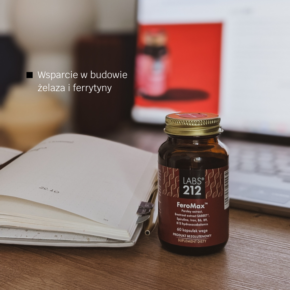 FeroMax® is a dietary supplement provided in vegan capsules intended for people with low iron and ferritin levels. Iron levels are one of the most important indicators of human health. Iron is responsible for tissue regeneration and their proper growth, and supports the fight against free radicals. Iron is the building block of hemoglobin, is involved in the production of red blood cells and contributes to liver detoxification. Iron deficiency manifests itself, among others, in: feeling tired, pale skin, tightness in the chest, cold hands, lack of appetite, weakened hair condition. It is worth regularly testing the concentration of iron and ferritin and consulting the results with a doctor or dietitian.