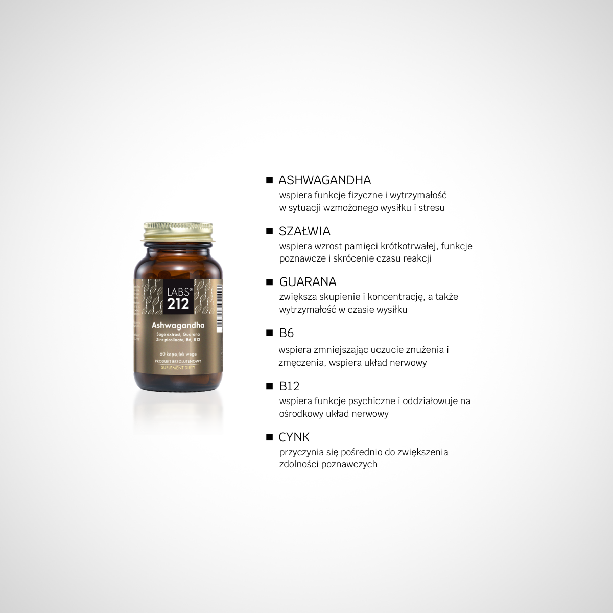 Ashwagandha is a dietary supplement in the form of a capsule containing Ashwagandha extract, Sage extract, Guarana seed extract standardised to contain 22% caffeine, Zinc Picolinate (organic form), Vitamin B6 and B12 in the form of methylcobalamin and, additionally, L-Leucine and acacia fiber.