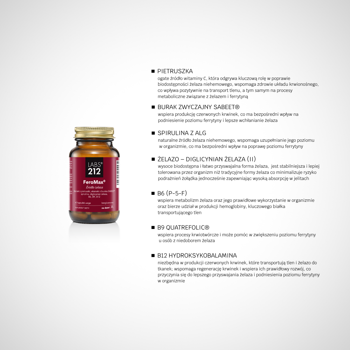 Suplement diety FeroMax® to preparat w postaci kapsułki zawierający: ekstrakt z liścia pietruszki (Petroselini crispum), ekstrakt z korzenia buraka zwyczajnego SABEET ® (Beta vulgaris), spirulinę z alg (Arthospira Platensis), żelazo w formie diglicynianu żelaza (II), witaminę B6 w formie P-5-P (pirydoksyny-5-fosforan), witaminę B9 w aktywnej metabolicznie formie kwasu foliowego – soli glukozaminowej (6S)-5-metylotetrahydrofolianu, witaminę B12 w formie hydroksykobalaminy.