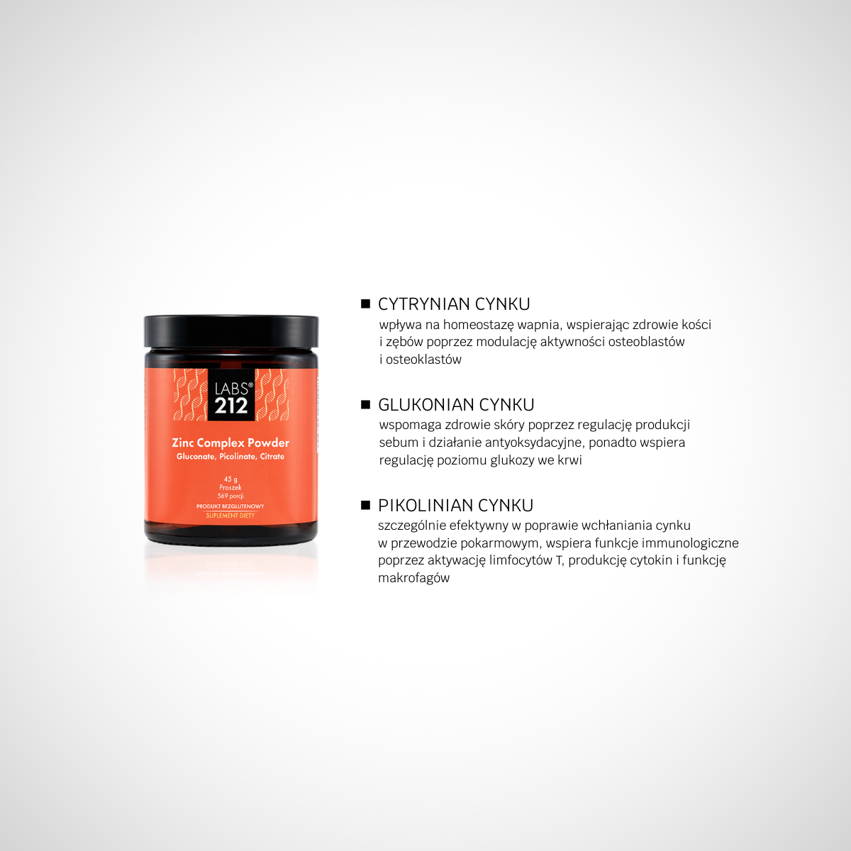 Suplement diety Zinc Complex Powder to preparat zawierający 569 porcji cynku w postaci związków organicznych: pikolinianu cynku, glukonianu cynku i cytrynianu cynku. Cynk nazywany jest „niezbędnym pierwiastkiem śladowym”.