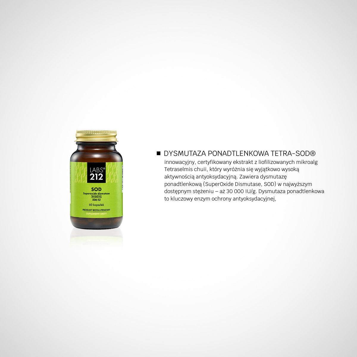 TetraSOD® jest najbardziej skoncentrowanym źródłem SOD na rynku, z klinicznie udowodnioną skutecznością w aktywacji ścieżki odpowiedzi antyoksydacyjnej w komórkach ludzkich. Tetra-SOD® zawiera dysmutazę ponadtlenkową w najwyższym dostępnym stężeniu 30 000 IU/g.