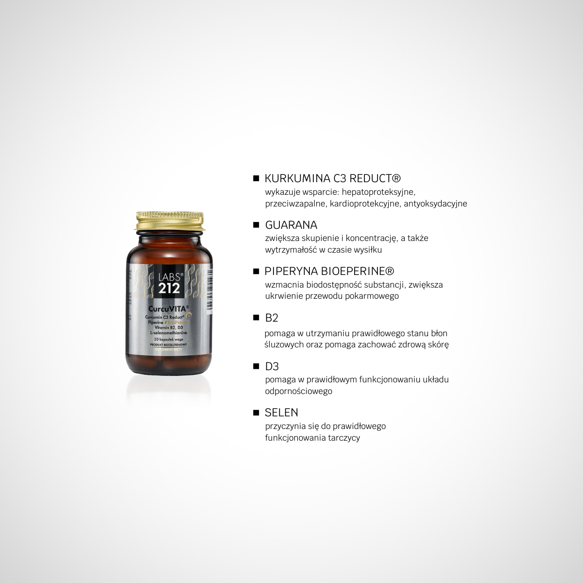 Suplement diety CurcuVITA® to preparat w postaci kapsułki zawierający wysokiej jakości kurkuminę C3 Reduct® (DER 100:1) standaryzowaną do 95% tetrahydrokurkuminoidów, patentowaną piperynę BioPerine® (DER 50:1) standaryzowaną do 95% piperyny, ryboflawinę, naturalną witaminę D3 oraz selen w formie L-selenometioniny.